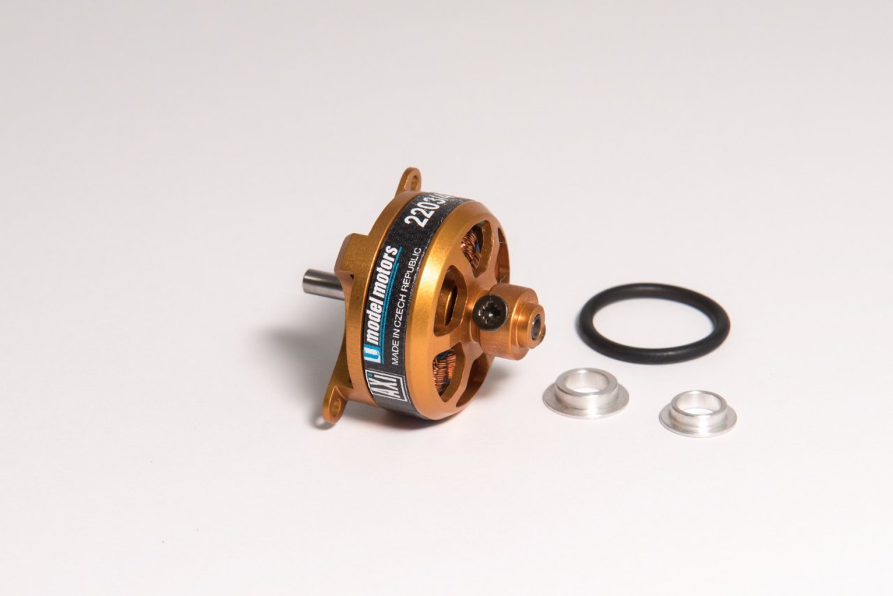 New very light and powerful motor AXI 2203/RACE SAVER GOLD LINE V2 with shaft, these motors have integrated prop adapter and three-point mounting lugs reach just 19 g in weight. This motor was tuned by Gernot Bruckmann especially for area of fast indoor aerobatic models. Three-point mounting lugs allowseasy mounting to the fuselage of model and fast centering of motor. 3,17mm best quality hollow shaft is supported by two ball bearings. This motor is suitable particularly for light AIR RACE and fast aerobatic indoor models up to 170g in weight.